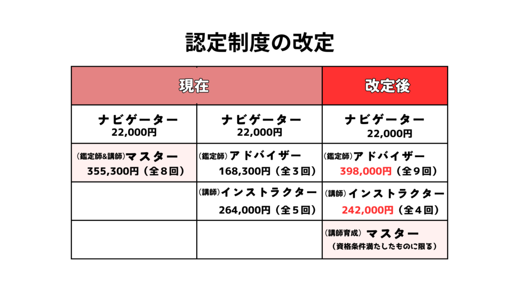 改定後には現在のマスター(アドバイザー+インストラクター)の内容は鑑定師(アドバイザー)だけの資格となり、講師をしていく場合は別にインストラクターの資格を取得していただきます。